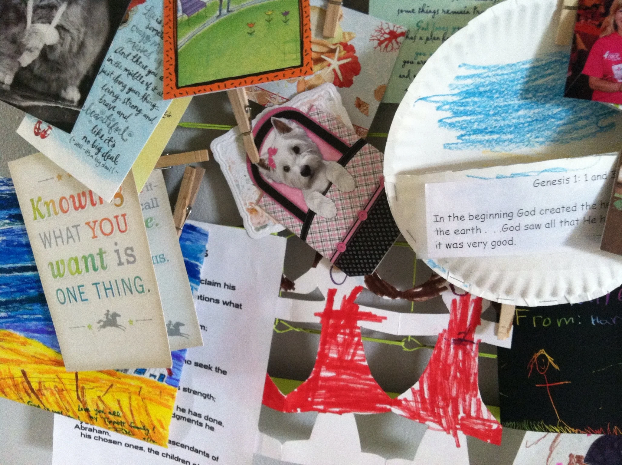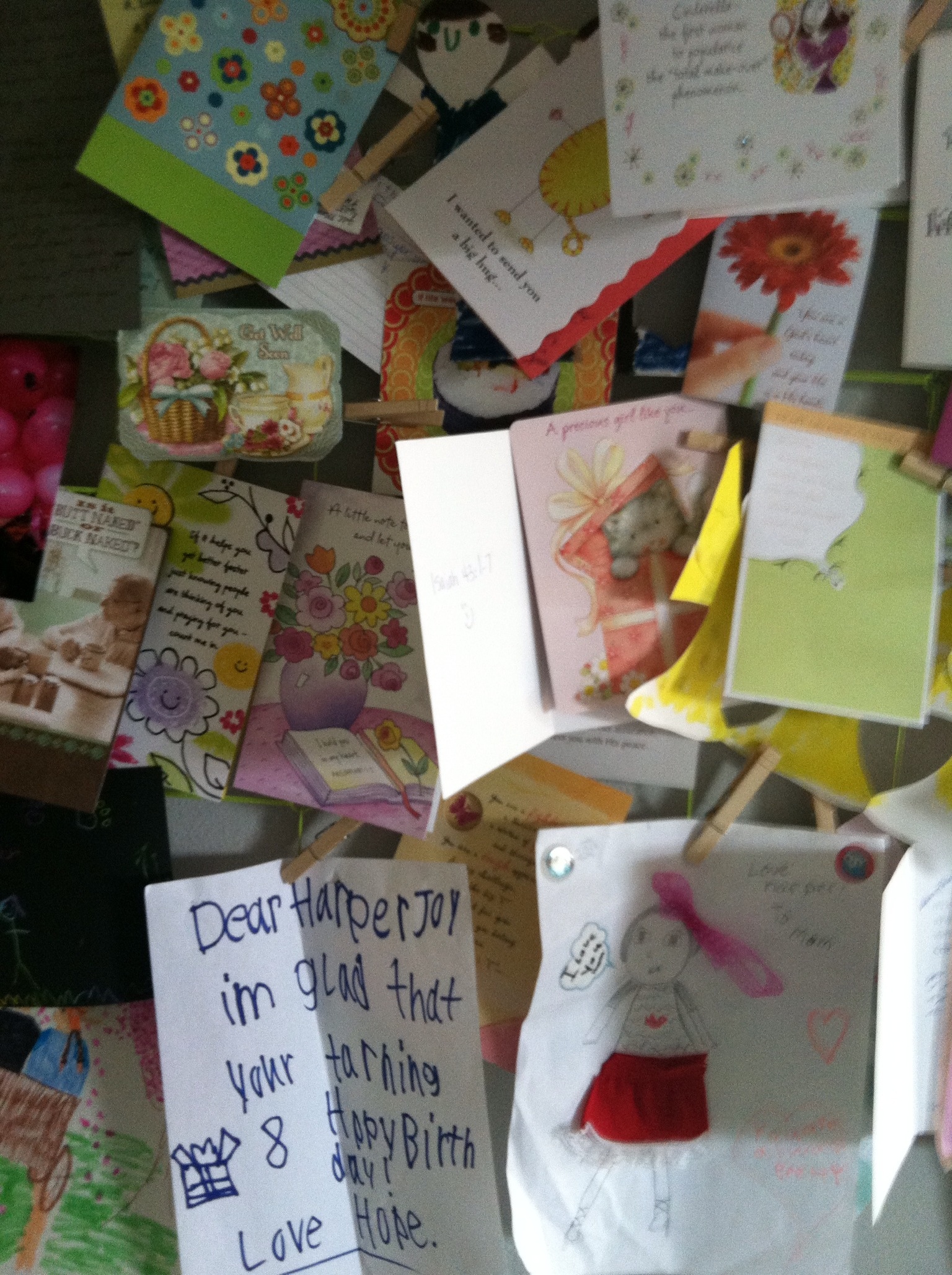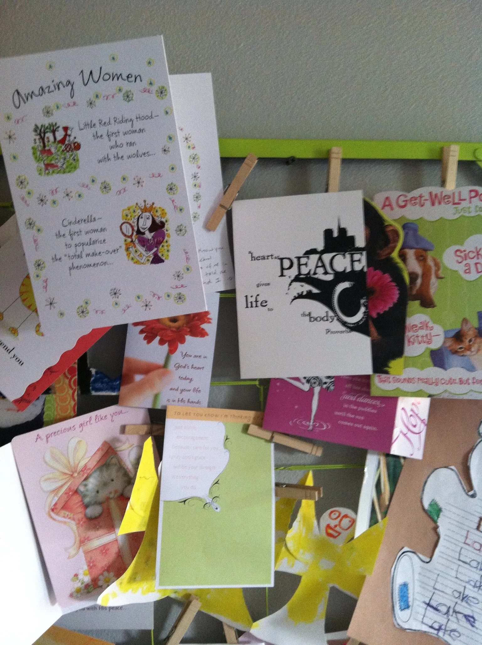 Every day I look forward to my mail. The endless cards, prayers, letters, gifts, and treats bless me to no end. A treasured friend purchased me a crib spring that was painted to hang on the wall. In short order, this frame represents a small portion of the love that comes our way.