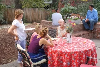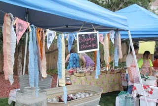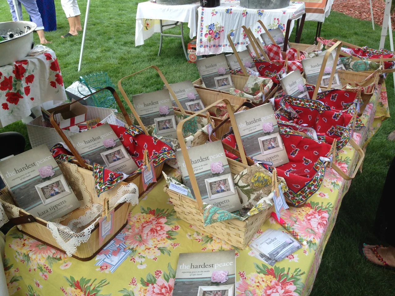 Heather booked a bluegrass band. Jill made fun banners. Shelley and Connie jumped in to help too. We had booths for the kids, who wore vintage aprons and made jars of cookie mix and did miniature paintings. We set up an easel to hold a beautiful painting of a vase Lindsay had done where adult guests could add their own creative touch to the canvas with flowers. Kara joked with me that we were both “includers,” and had it been left to us, we would have had 2,000 folks there. But our yard is only so big. We barbecued and had a huge feast. Kara read from her book on the back patio and wept as we listened earnestly to the truth and grace God had given her to share. It will remain a treasured memory for me always.