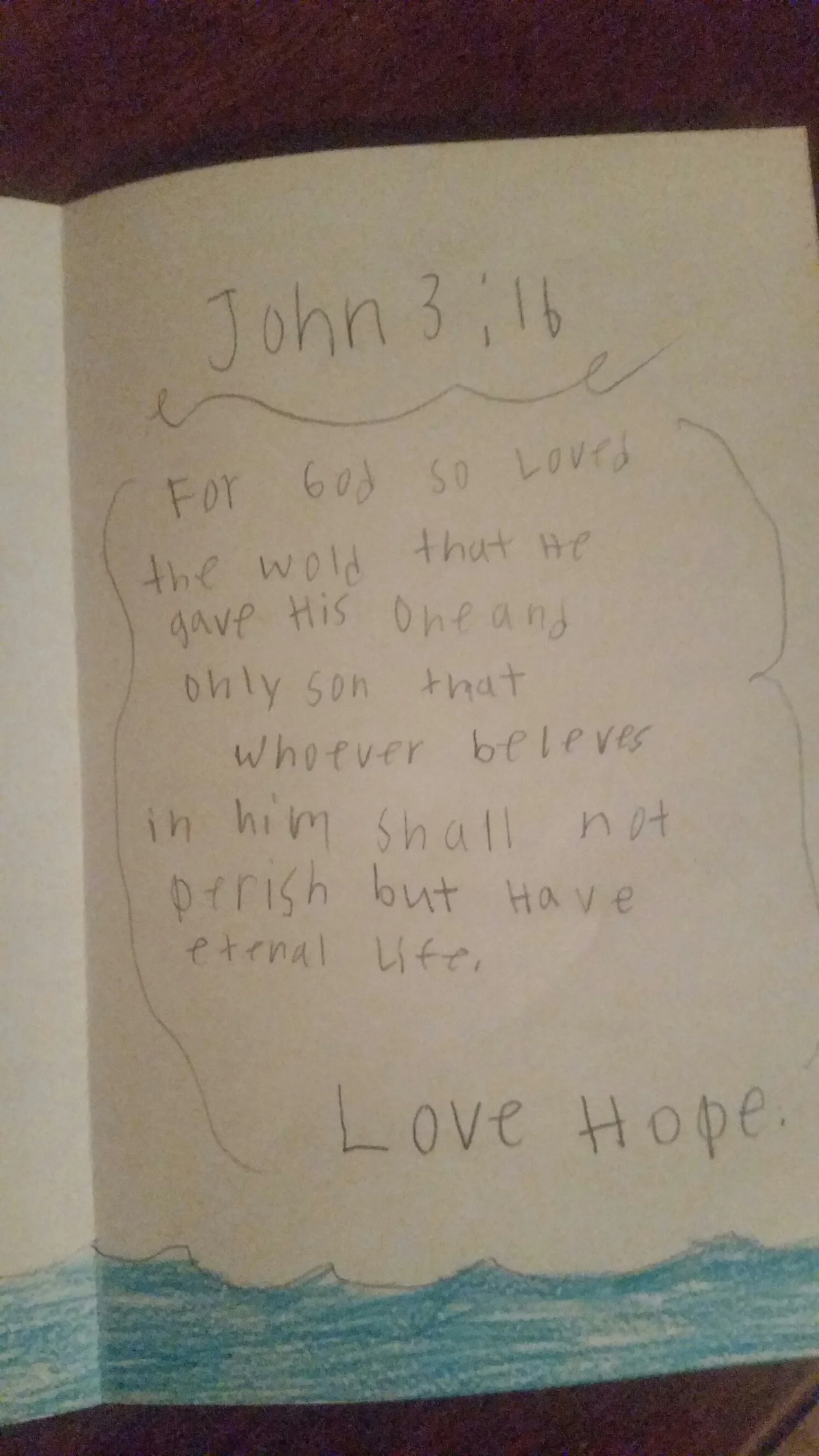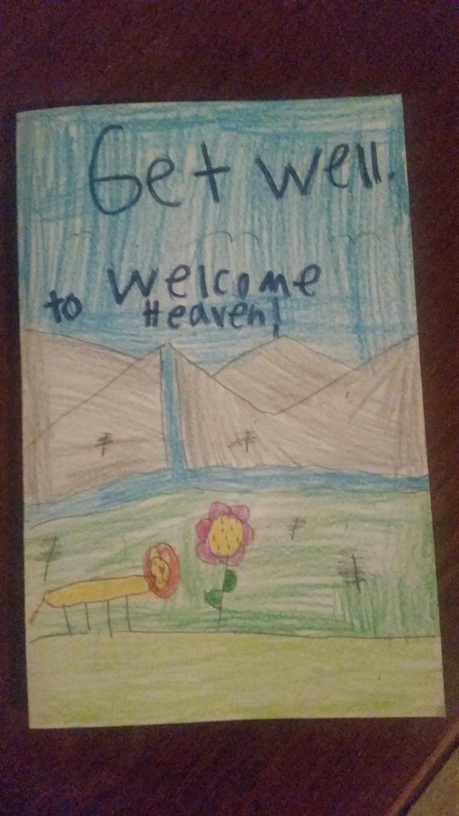 I will end my Kara story with this prayer that my 10-year-old daughter Hope wrote when she was heavily grieved for “dear Mrs. Tippetts.” The loss of her Nanny had hit Hope hard, and to learn Mrs. Tippetts might be going to Heaven soon was a large burden for her sweet heart. I asked her if maybe she would like to make a card for Mrs. Tippetts. Her face lit up and she set to doing it. I call this a prayer because it is a prayer only a child’s heart could express. On the front, she wrote boldly, Get Well Soon and Welcome to Heaven! Hope had an intuition that Kara would need to get to Heaven to be completely healed. On the inside, she wrote out John 3:16: “For God so loved the world, that he sent his only begotten son that whoever believes in him, will have eternal life.” She drew a picture of a lion, which in her mind is the bravest of all of God’s creatures. Sweet and simple, but profound.